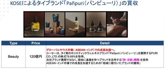 - コーセー:タイ高級スパブランド「Pañpuri」を買収し、東南アジア市場でのプレゼンス強化。