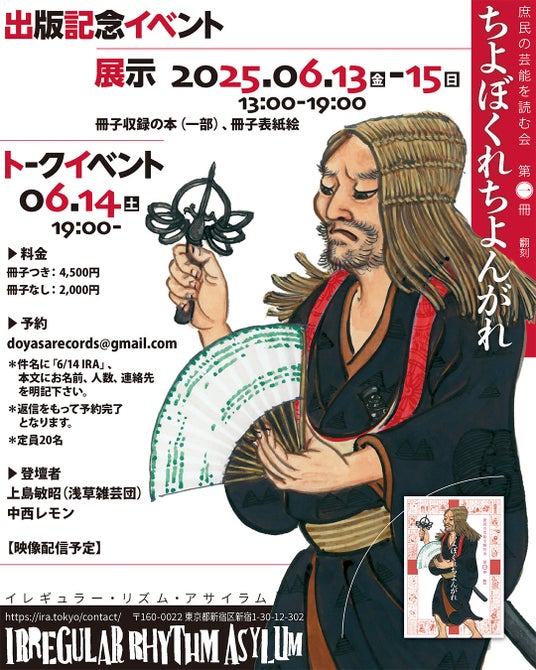 近年関東での初代桜川唯丸流江州音頭の音頭取りとして、また東北民謡や越後の瞽女唄を歌ったアルバム『ひなのいえづと』で注目を集める中西レモン。2017年より中西が案内人を務める「庶民の芸能を読む会」で、参加者とともに読み進めてきた江戸後期以降の歌や語りといった芸能に関する資料の中より、今回ちょぼくれ・ちょんがれに焦点を当てた翻刻集を『庶民の芸能を読む会 第一冊 翻刻 ちよぼくれちよんがれ』として2025年6月に刊行した。刊行を記念し、6/13~15 には新宿にて展示・トークイベントを開催。トークゲストには冊子に解説を寄せている芸能研究家・実践家の上島敏昭氏が登壇した。