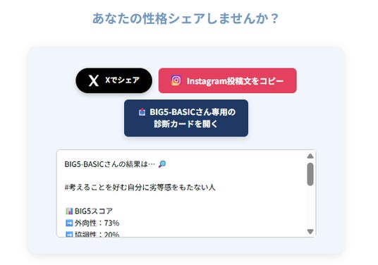 BIG5-BASICの診断カードは、SNS上でも手軽に共有できる仕組みを備えています。自身の性格傾向をわかりやすく表現できるため、利用者がX(旧Twitter)やInstagramなどのSNSに投稿し、自己理解を共有するきっかけとして活用されるケースも増えています。こうしたシェア文化が、新たな利用者層の広がりにもつながっています。