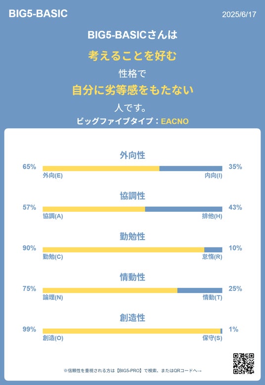 BIG5-BASICは、どなたでも無料で受診できるWeb性格診断サービスです。心理学の主要な性格理論である「ビッグファイブ理論」に基づき、約10分程度の質問に答えるだけで、自分自身の性格傾向を5つの主要因子(外向性・協調性・勤勉性・情動性・創造性)から多角的に可視化できます。診断結果はグラフやスコアでわかりやすく表示され、仕事・人間関係・キャリア設計・自己分析など、さまざまな場面で活用されています。