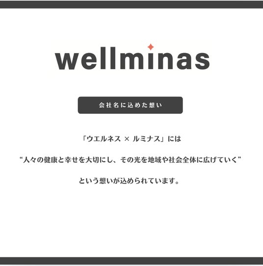 ■ 新会社名に込めた想い新社名「Wellminas(ウェルミナス)」は、 Wellness(健康・健やか) × Luminous(光り輝く) を組み合わせた名称です。 「人々の健康と幸せを大切にし、その光を地域や社会全体へ広げていく」 という想いを込め、利用者様・ご家族・地域、そして職員一人ひとりが、健やかで輝ける未来を創っていく企業を目指します。