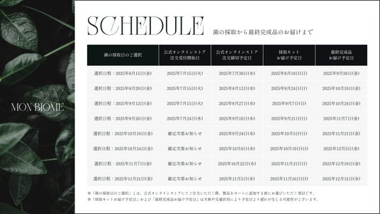 このたび、お客様に安心してご購入いただけるよう、ご注文時にお選びいただく「菌の採取日」ごとのスケジュール表を作成し公開いたしました。