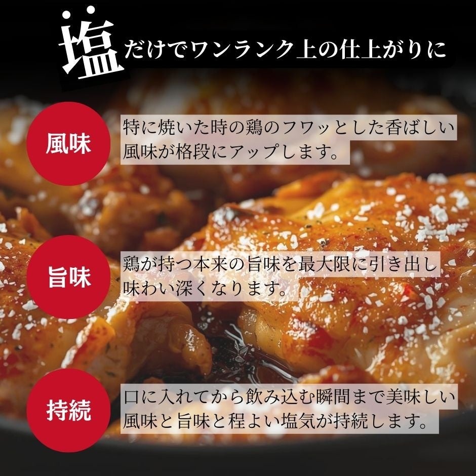粒度の異なる塩、鶏の持つ旨味を引き立て、焼いた時の風味を引き出す特徴を持った塩や、柔らかい鶏の肉質に合う少し甘みを持つまろやかな味の塩などをブレンドし、旨み設計、香り・塩味・余韻のバランスを細かく調整し、“ふりかけるだけ・揉み込むだけで味が決まる”ことを追求しました。