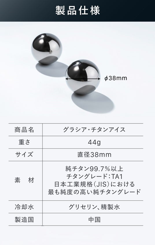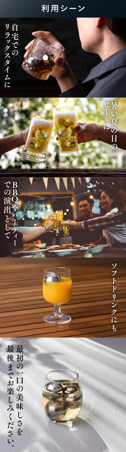■ 職人が仕上げた“見せたくなる氷”本製品は、職人の手により一つひとつ丁寧に磨き上げられた球体のチタンアイスです。まるで宝石のような光沢で、ドリンクタイムに華やかさと特別感を添えます。冷却性能と美しさを両立した、ギフトにも最適な逸品です。