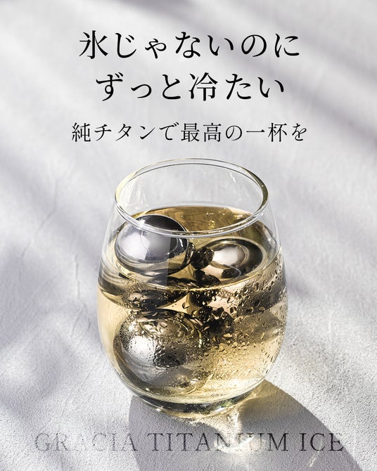 暑い季節、せっかくの飲み物も、氷が溶けて薄くなってしまっては台無しです。グラシア・チタンアイスなら、冷たさはそのままに、風味を損なわず最初の美味しさを持続します。艶やかに輝くチタンがグラスの中で反射し視覚でも楽しませてくれます。