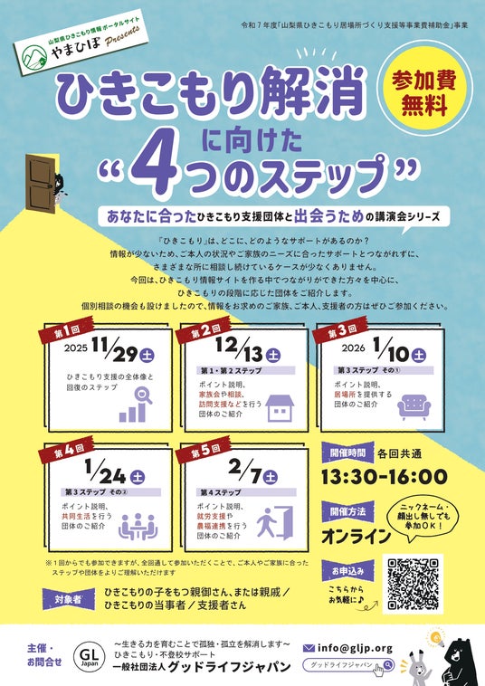 生きる力をを育むことで孤立孤独を解消します~ひきこもり・不登校サポートの一般社団法人グッドライフジャパン(山梨県北杜市須玉町江草5573 代表理事:川田史郎)は、2025年11月29日(土)から2026年2月7日(土)まで全5回で、「ひきこもり解消に向けた“4つのステップ” あなたに合ったひきこもり支援団体と出会うための講演会シリーズ」 をオンラインにて開催します。