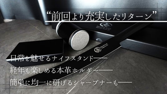 話題を呼んだ黒刃包丁「墨月-Sumitsuki- 」が再登場。今回のプロジェクトではリターン内容も強化し、12月1日より最大45%OFFの先行割引を実施します。