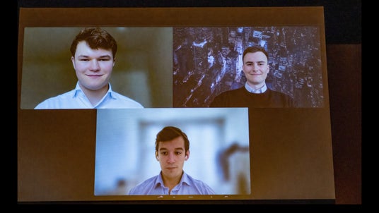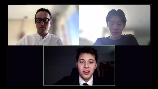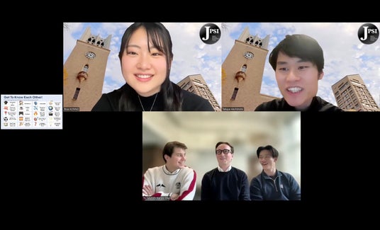 JPSI運営メンバー、紺野里紗氏と橋本卓也氏が、昨年の優勝校であるドイツ ミュンヘン工科大学「TU Investment Club」メンバーに英語でインタビューを行う様子