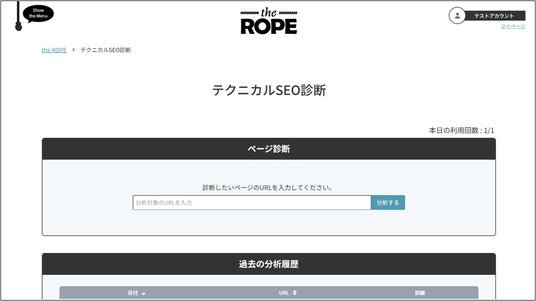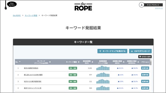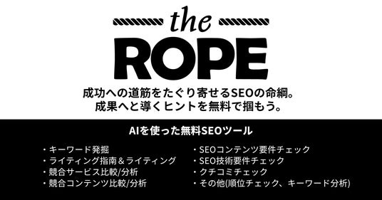 東京ウェブ株式会社(本社:東京都港区、代表:清野 剛)は、2025年11月14日、AIを活用してSEO(検索エンジン最適化)に関する煩雑な分析や調査作業を支援するツール「the ROPE(ザ・ロープ)」のベータ版をリリースしました。「the ROPE」は、SEO施策に必要とされる主要な機能を網羅的に搭載し、それらをまとめて無料でAI提供するツールとしては国内初(※自社調べ。2025年10月時点、国内における主要AI活用SEO分析ツールにおいて)となります。まずはベータ版として3つの機能(AIライティング、施策キーワード発掘、テクニカルSEO診断)からスタートし、その後1ヶ月に3機能ずつのペースで、順次新しい機能を追加リリースしていく予定です。