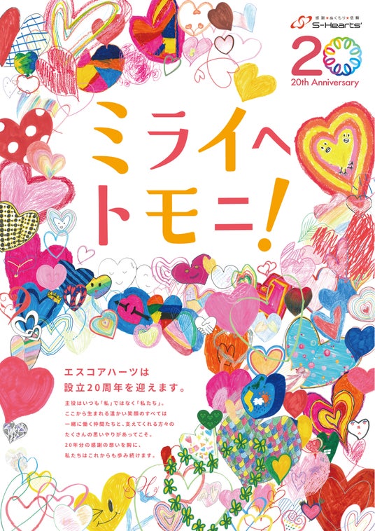 広告制作・サブスク事業を展開する株式会社Subschive(サブスカイブ、神戸市兵庫区、代表取締役社長岸修平)は、株式会社ノーリツの特例子会社である、株式会社エスコアハーツ(兵庫県稲美町、代表取締役社長新田博哉)の創業2 0周年事業におけるクリエーティブ制作を受託し、周年コンセプトのテーマである「ミライへトモニ!」を象徴するキービジュアルの公開をお知らせいたします。本ビジュアルは、障害の有無を問わず全従業員が描いた「ハート」を素材に、障害者アートに知見を持つS u b s c h i v e社のチームが編集・レイアウトを行い、ひとつのビジュアルとして制作いたしました。従業員・取引先・ご家族・就労支援事業所など、エスコアハーツ社に関わる多様なステークホルダーと「トモニミライヘ」進む意思を、周年の旗印として可視化。今後もアート・デザインなどクリエーティブ領域から障害者支援に取り組んでまいります。また、障害のある方の表現機会を“伝わる形”にして循環させることを目指し、社内外への理解促進に活用してまいります。