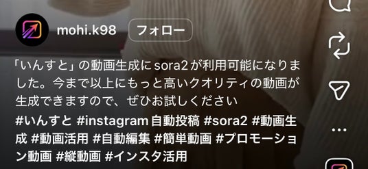 「いんすと」は、投稿代行や編集代行に代わるSNSマーケティングの新常識になることを目指しています。今回のSORA2搭載によるアップデートは、単なる機能向上に留まらず、AI生成動画が生成動画の枠を超え立派なエンターテインメントとなり爆発的な集客に繋がると考えています。現在先着適用の割引など行っています。単なる質問でも構わないのでお問い合わせは「いんすと」のホームページにお願いします。今後も、最先端のAI技術を取り入れ、お客様の集客・売上向上に貢献してまいります。