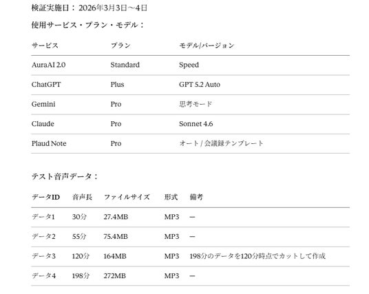 - 他社サービスの仕様・性能については検証実施日(2026年3月3日~4日)時点のものであり、各社のアップデートにより変更される可能性があります。