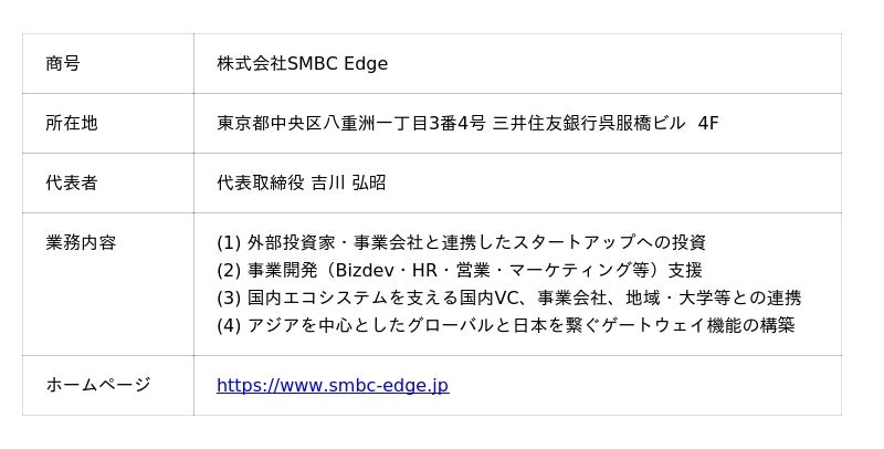 SMBC Edgeは、日本の再成長に資する新規事業・スタートアップの成長支援を通じ、日本の産業全体の国際競争力向上への貢献を目指しております。