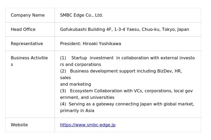 By supporting the growth of new businesses and startups, SMBC Edge aims to contribute to enhancing the international competitiveness of Japan’s industrial ecosystem. SMBC Edge will continue to invest in initiatives focused on new industry creation, addressing social challenges such as population decline and labor shortages, and supporting global expansion.