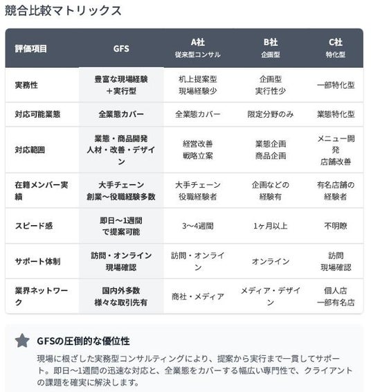 原価高騰、人材不足、後継者不足、競争環境の激化など、飲食業界は今、大きな転換期を迎えています。一方で、現場に優れた価値や可能性がありながら、「仕組み」「人材」「再現性」が不足することで、本来の力を発揮できていない飲食店・ブランドも少なくありません。GFSは、実店舗運営の現場経験と専門的なコンサルティング知見を融合し、単なる助言に留まらない「実行され、成果につながる支援」を実現するために設立しました。