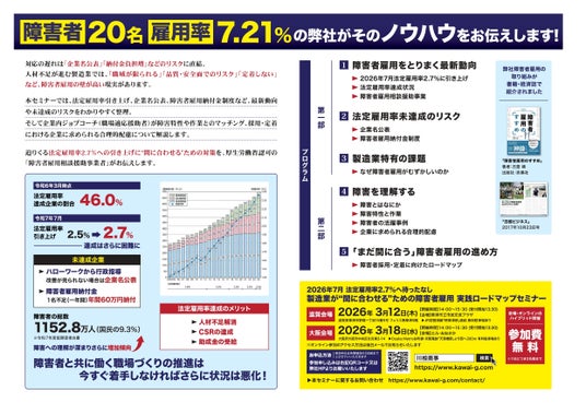 本セミナーでは、法定雇用率引き上げ、障害者雇用納付金制度など最新動向や未達成のリスクを整理し、企業内ジョブコーチ(職場適応援助者)が障害者特性や作業とのマッチング、企業が行うべき合理的配慮など、採用・定着実現に向けたロードマップをわかりやすく解説します。