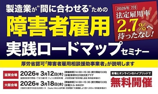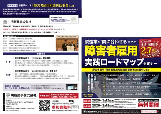 人材派遣・製造業務請負を手掛ける川相商事株式会社(本社:大阪府門真市、代表取締役社長:川相 知正、以下:川相商事)は、製造業における障害者雇用のポイントを解説する無料セミナーを来場・オンライン参加可能のハイブリッド形式で開催いたします。