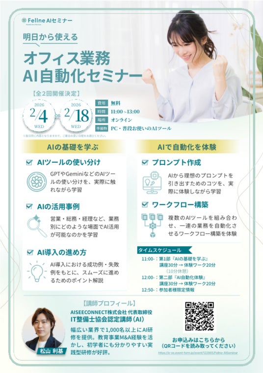 AISEE CONNECT株式会社(代表取締役社長:松山 利基、以下「AISEE CONNECT」)は、2026年2月4日および18日に、株式会社オカモトヤ(https://www.okamotoya.com/)が運営する女性活躍推進事業“Fellne”(https://fellne.net/)※と協力し、『明日から使える、オフィス業務AI自動化セミナー』を開催いたします。
