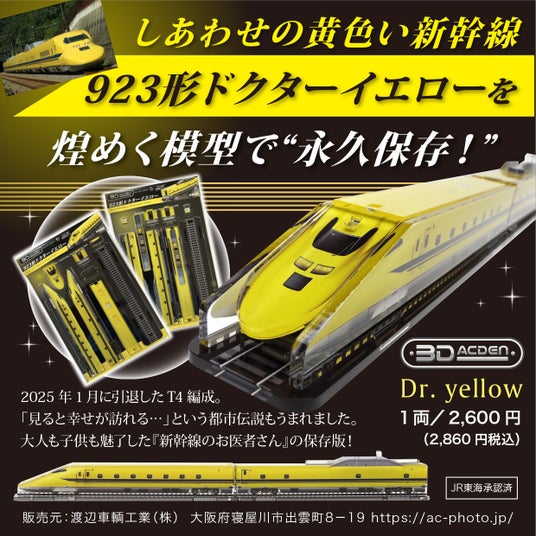 渡辺車輌工業株式会社(本社:大阪府寝屋川市 代表取締役:浅井輝明)は創業以来68年にわたり鉄道車両の清掃事業を通じて電車と深く関わってきた経験を活かし、日本初のアクリル製立体鉄道模型の組立てキット「3Dアクデン」を展開しております。2024年の発売以来、京阪電車シリーズ「特急8000系」や「3000系」が鉄道ファンから高い評価を得ており、近鉄「ひのとり」「8A系」JR新幹線「923形ドクターイエロー」、「500系のぞみ」などの商品化を経てこの度、昭和時代に活躍した近鉄「10100系新ビスタカーA編成」3両セットの販売を開始しました。