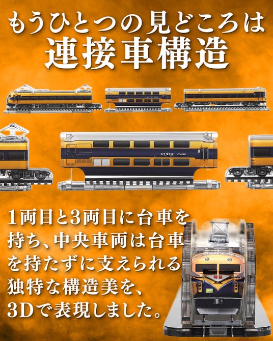 ・特徴:立体組立てキット(アクリル製)連結可能で編成を再現。光を通す透明感で様々な表情を楽し める