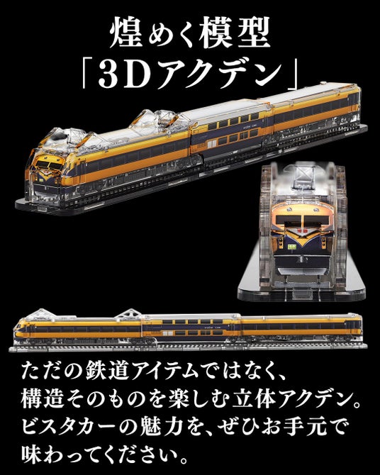 「3Dアクデン」はガラスより透明度が高いアクリル板に実車両を忠実に再現したCG画像をプリントし、複数のパーツを組み立てることで立体的な鉄道模型を完成させるキットです。従来のプラスチック模型や平面的なアクリルスタンドとは異なり窓辺やLEDライトの光が透過・反射してキラキラと輝くのが最大の特徴。まるで「アクリルケースの中に高級模型が入っている」ような美しい仕上がりで、走行させるのではなく「飾って楽しむ」新感覚のインテリア鉄道模型として注目を集めています。