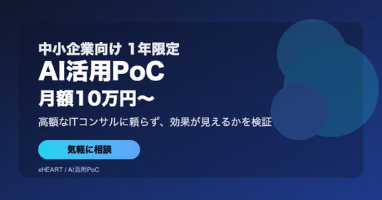 最安月額10万円から始められる「AI活用PoC」サービスを1年間限定で提供。当社のこれまでのAI導入・開発支援の実績を踏まえ、「AI活用で効果が見えそうか」を検証し、意思決定につなげるPoCを実施。
