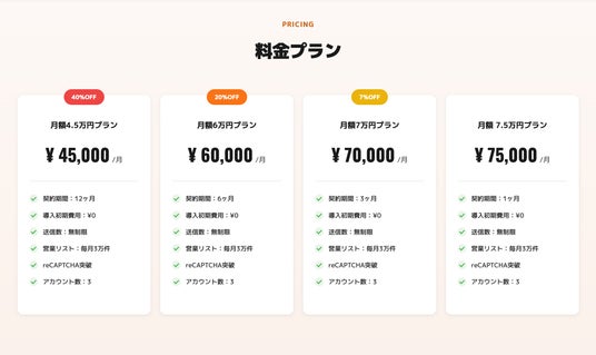 すべてのプランで送信数無制限・reCAPTCHA突破・毎月3万件の営業リスト提供・アカウント数3つが含まれます。