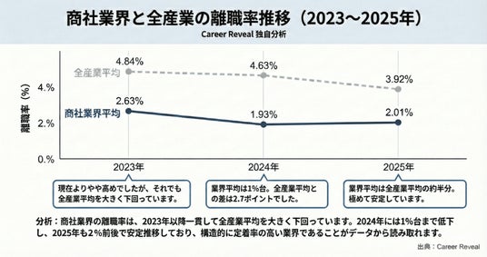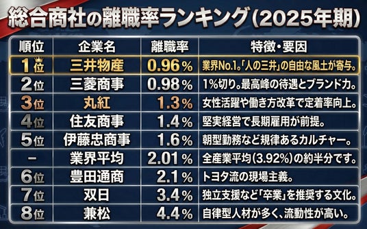 本調査では、離職率ランキングとともに、各社の開示情報から読み取れる定着要因(制度・カルチャー)を整理し、商社業界の「定着力」を可視化しました。