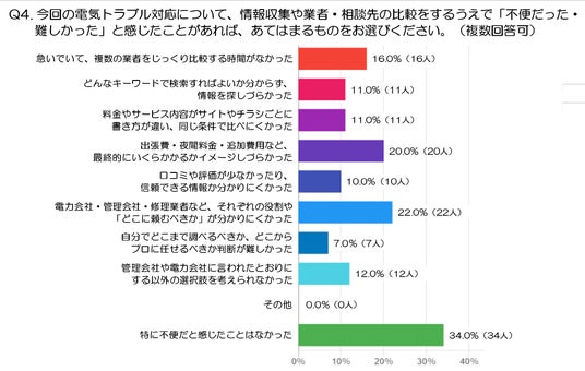 Q4. 今回の電気トラブル対応について、情報収集や業者・相談先の比較をするうえで「不便だった・難しかった」と感じたことがあれば、あてはまるものをお選びください。(複数回答可:注2)