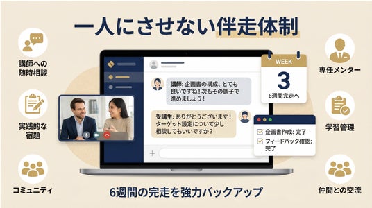 「一人にさせない」伴走体制。ワーク時間外でもチャットでのフィードバックや個別相談が可能で、6週間の完走を強力にバックアップします。