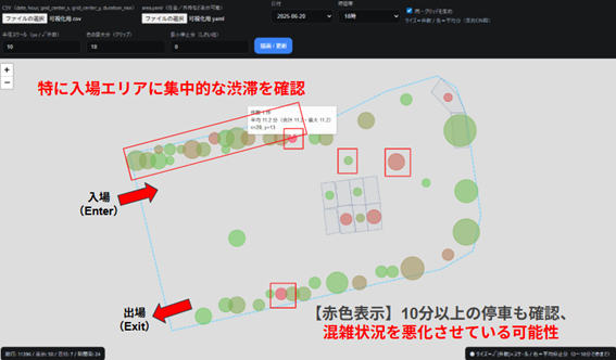 - 停車状況の可視化:夕方以降は停車可能場所が34~55%占有されている可能性を確認、また西口暫定ロータリーを覆うほどの滞留を簡易ダッシュボードで可視化した。