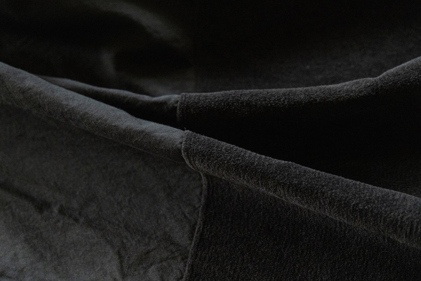 コレクションで使用する生地は、中川が大学院時代より建築設計者として継続して関わっている山梨県富士吉田市のま ちづくりを介して知り合った、機屋であり、テキスタイルブランドWatanabe Textileを主宰する渡邊竜康氏と協働し、 特別に織られたものも含まれています。 渡邊氏もキャリアを建築からスタートしており、両者は生地を「マテリアル」と呼び、建築と衣服のテクスチャーをフ ラットに思考しながら制作に取り組んでいます。打合せでは建築写真や風景の写真が共有され、分野を超えた対話が行 われています。この協働は、地域のものづくりと分野横断的な思考が融合した実践例となっています。
