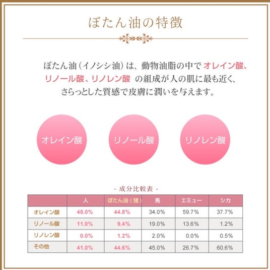 従来の馬油よりも人の皮脂組成に近いといわれるイノシシ油は、肌への浸透性が高く、自然でやさしい使用感が特長です。