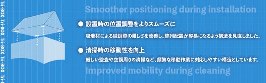 吸着材による微調整の難しさを改善し、整列配置が容易になるよう構造を見直しました。厳しい監査や空調周りの清掃など、頻繁な移動作業に対応しやすい構造としています。
