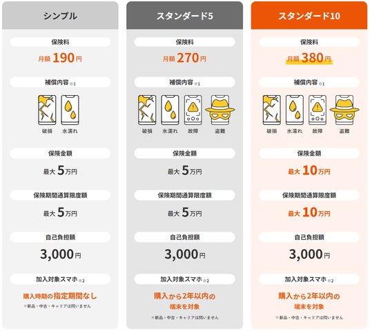 お手頃なシンプルプランに加え、故障・盗難も補償するスタンダードプランは保険金額が異なる