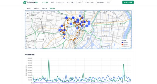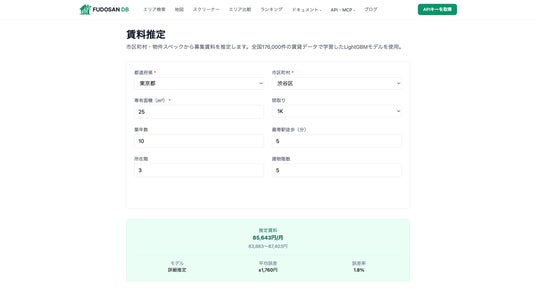 売買取引価格620万件超、地価公示・調査13万件に加え、機械学習による賃料推定エンジン(誤差率1.8%)、賃料変動予測、収益シミュレーションを搭載。ChatGPTやClaudeからコネクタ経由で直接接続でき、自然言語で不動産データを分析できます。