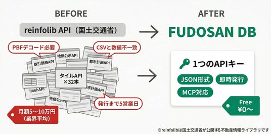 タイルAPIはJSONではなくPBF(Protocol Buffer Binary Format)で返ってくるため、デコードと座標変換が必要です。CSVとAPIで同じ取引の面積が5~15m²ずれるため、単純なJOINでは統合できません。前処理だけで数週間~数ヶ月。その間、本来のプロダクト開発は止まります。また、APIキーの発行にも数日以上かかります。