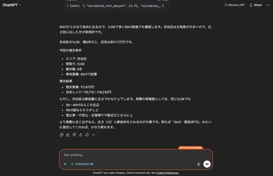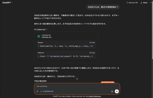 ChatGPTからFUDOSAN DBに接続。「渋谷区の家賃相場は?」に実データで回答