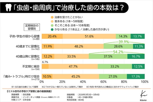 3.40歳以降に定期検診が習慣化した層の54.2%が治療した歯「6本以上」、40歳までに習慣化した層の約1.4倍