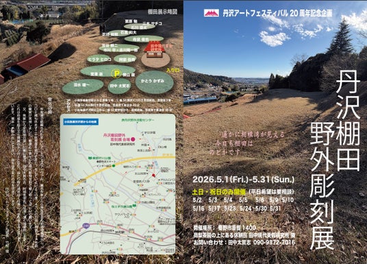 神奈川県秦野市を中心に著名作家から小学生まであらゆる垣根を外して市民の皆さんと共に歩んできた丹沢アートフェスティヴァルが今年で20周年となりました。今回は20周年企画として丹沢棚田野外彫刻展/5WINDSー5人の版画家/黒澤明ドキュメンタリー上映会を企画しました。5/1~5/31の期間中秦野市周辺エリアの40のギャラリー等平面立体現代アート音楽映画やワークショップが行われます。ぜひご来場ください。