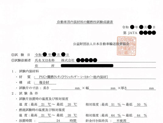 車内の内装規定をクリアした難燃性素材のみを使用しているため、装着したまま継続車検を受けることが可能です。シートカバーのために車検のたびに取り外す手間がありません。ただし、検査機関によっては「難燃証明書」の提示を求められる場合があります。証明書はあらかじめダウンロード・印刷のうえ、車検証と一緒にご携帯ください。