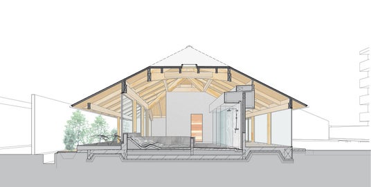 建築は、5.5間の正方形平面に大きな「宝形(ほうぎょう)屋根」を冠した、善光寺の経蔵にも似た凛とした佇まい。高い天井による浴室内の圧倒的な開放感と、低い軒先が生み出す縁側の心地よさという相反する要素を、一つの屋根の下で実現しました。