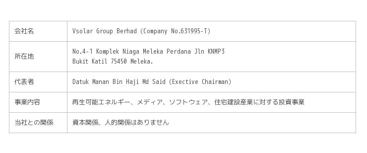 この度、当社とVsolar Group Berhad(マレーシア証券取引所上場 KLSE:631995-T)とはマレーシアにおける大規模太陽光発電所建設・運営に関して共同で事業を行うことについて合意致しましたので下記の通りお知らせいたします。