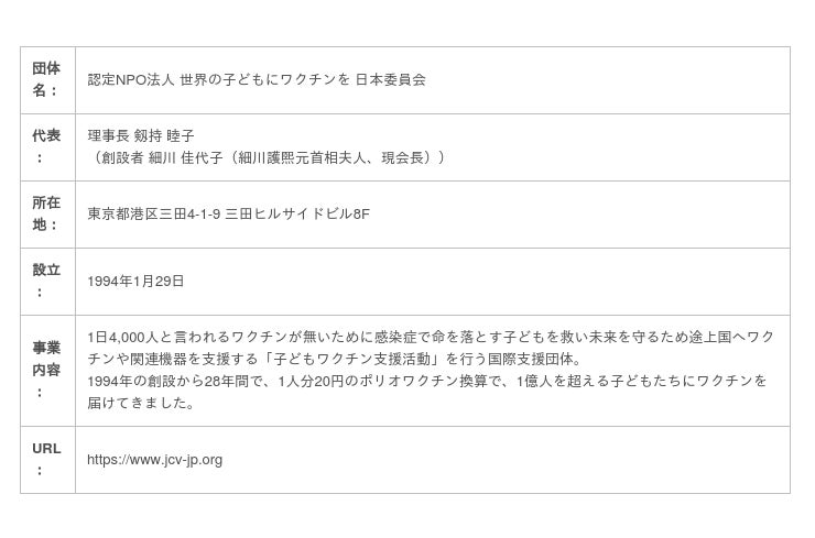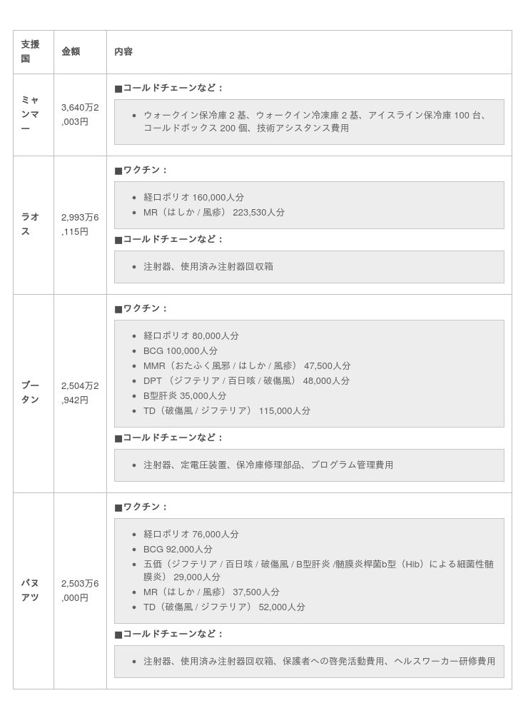 世界中の人々の健康や生命を脅かし、社会全体に深刻な影響を及ぼす感染症に国境はなく、ワクチン接種が抑止力のひとつです。特に、医療が行き届かない国では、感染症を予防するワクチンが、子どもたちの命を守るために大きな効果を発揮しますが、自国でワクチンを賄えない多くの国の子どもたちが、支援を必要としています。支援活動へのご協力をどうぞよろしくお願いいたします。