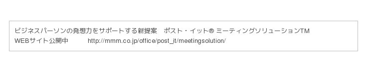 ポスト・イット(R) ブランドは、2015年2月よりポスト・イット(R) 製品を活用して発想力を高めるミーティングのメソッドとして「ポスト・イット(R) ミーティングソリューション™」を提案しています。今回発売する、「ポスト・イット(R) ホワイトボードフィルム」はクリエイティブなオフィス空間を簡単に作り出すことのできる製品として、アイデアや発想力を必要とする全てのビジネスパーソンをサポートします。