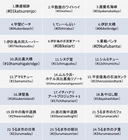 コンテスト開催にあたり、市内の“特に伝えたいうるまの景色”24スポットを設定、特定の「#(ハッシュタグ)」とともにSNS上でこのスポットの写真投稿を促してまいります。同じスポットでもさまざまな魅力を写真を通し発信されていくので、投稿者の数だけ魅力が作り出されることになります。