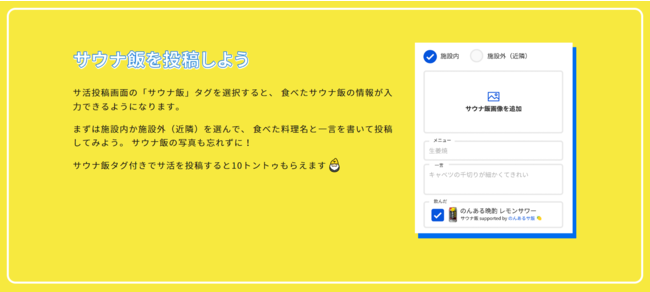その投稿機能に昨年より新たに「のんあるサ飯」プロジェクトとして、サウナに入った後に食べる「サウナ飯」投稿機能が追加。施設内の”サウナ飯”はもちろん、施設近くの飲食店の”サウナ飯”も日々多くのサウナ―さんに投稿頂いております。