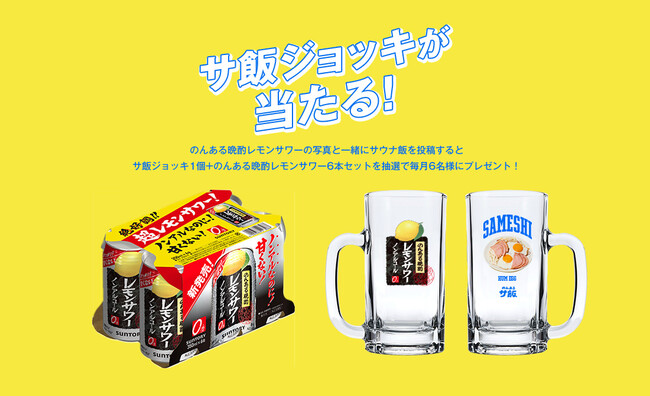のんある晩酌レモンサワーの写真と一緒に”サウナ飯”を投稿すると、サウナイキタイ×のんある晩酌レモンサワーのオリジナルジョッキとのんある晩酌レモンサワー6本セットが毎月6名様に当たります。
