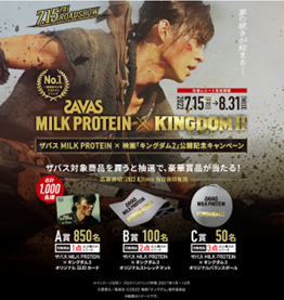 株式会社 明治(代表取締役社長:松田克也)は、プロテイン市場売上No.1ブランド(*)である「ザバス」の「ザバスMILK PROTEIN」シリーズにおいて、俳優の山崎賢人さんを起用したザバス×キングダム2コラボ特別版TV-CM(30秒)を2022年7月15日(金)に、日本テレビ放送網『金曜ロードショー/キングダム』内にて一回限り放映いたします。