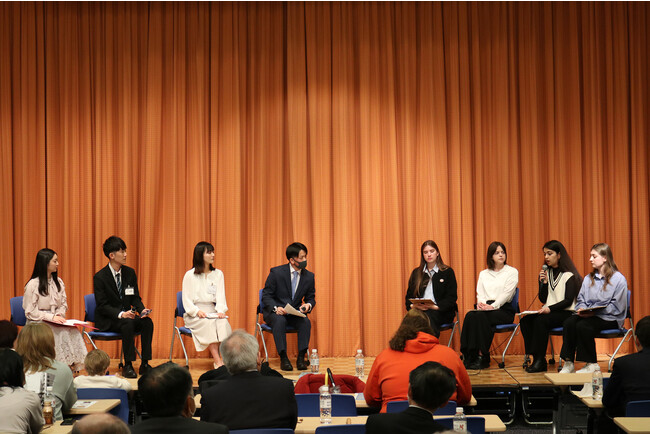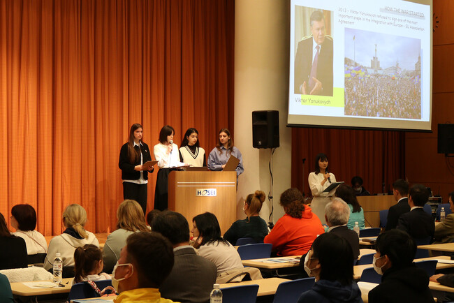法政大学に在学する留学生4名が壇上で、ウクライナの歴史、文化、そして今起きている現状などを日本の学生や参加者に向けてスピーチし理解を求めた。そして、日本の学生とのディスカッションでは、日本での生活のこと、将来のことなどの意見交換をし交流を深めた。